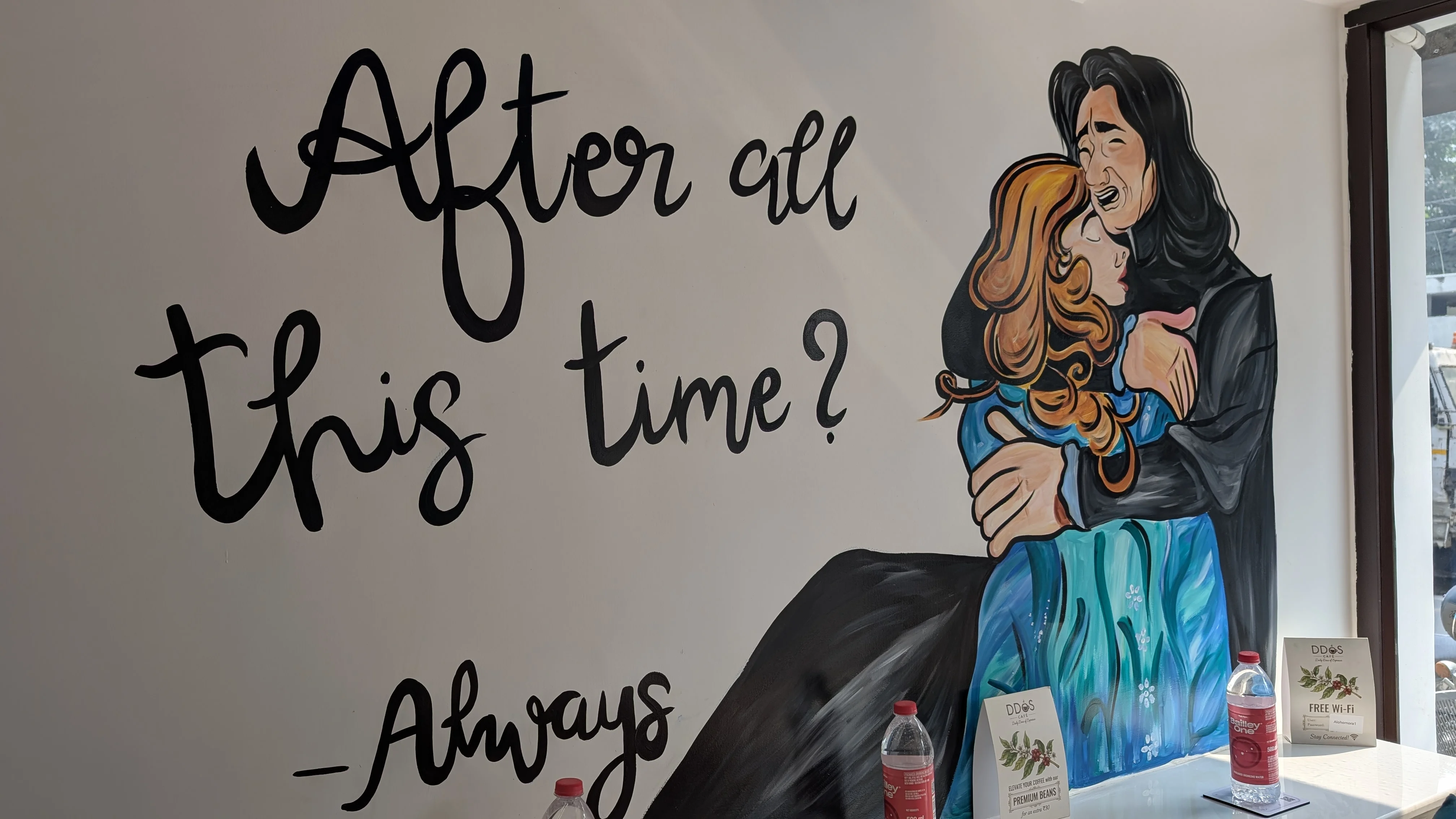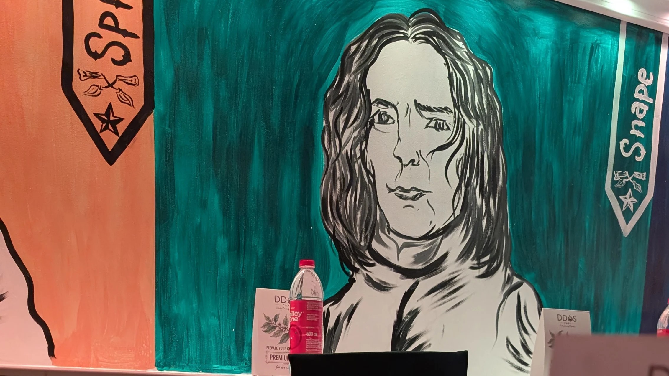 After finshing the movie, I went for a haircut. Got a french cut beard for the first time in my life 😛. Then while coming back home, I saw this new café near my house. From the outside, I saw this painting of Snape holding Lily. I got curious and decided to go inside.