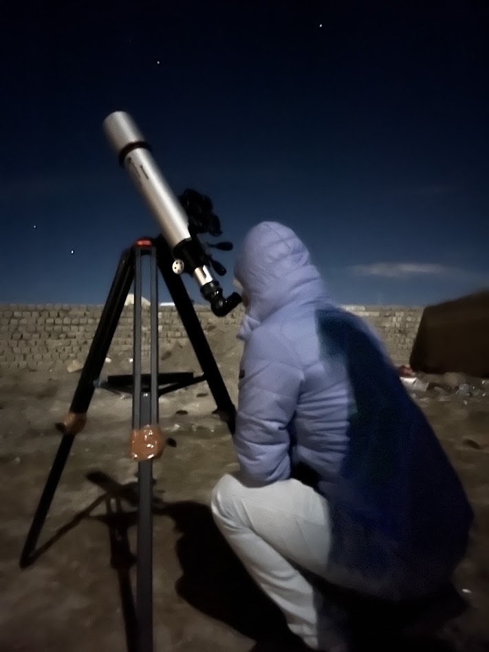 Then we reached Hanle in the evening right before the sun was about to set. Slowly, we started to see the stars come out. But I noticed a big problem in our plan. It was a full moon night, which meant that the moon would be so bright that it would illuminate everything and hide the stars and galaxy clusters. And unfortunately, I was right. As the night progressed, the sky was so bright that it hid most of the stars. On top of that, Hanle’s temperature gets very cold at night and there is zero electricity in the village after 10 PM. We were disheartened that we came so far but couldn’t see much. But there was a telescope available and we decided to at least see some major celestial bodies with it. We saw Saturn, Vega star, the Seven Sisters star cluster and the moon. As we were going back to our cottage to sleep in the dark night with the temperature dropping to –5°C — I had an idea. I told Yash and Taha that the moon would go down in the sky later, around 2 AM, and then we would be able to see the Milky Way. We decided to wake up at 2 to give it a try. When the alarm rang at 2 AM, everyone was feeling so sleepy and cold that we didn’t want to leave our blankets. But from somewhere I got the courage and went outside to see the situation. It was completely pitch-black dark and felt like I was standing in an abandoned village. But the moon was still there — a little lower but still illuminating the sky. Of all the love I have for the moon — on that day I hated it the most. I went back inside again and told them that it was not clear. We were about to go to sleep when I proposed that we check again at 4 AM. The alarm rang again at 4, and again I took the courage to go out. Maybe my inner child who used to love astronomy and stargazing was pushing me to do this. And when I went out this time, the village was still dark but so was the sky. There was no moon. All I could see were stars — endless stars shining into infinity. I ran inside and told them to come out of bed. They were also shocked to see this. We had completely forgotten about the –5°C. We just sat there looking at the stars and talking about them.